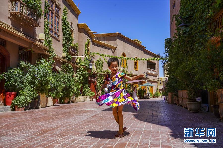 在喀什古城景区阿图什巷,一位当地小朋友随着巷子里播放的音乐跳起了舞蹈(7月8日摄)。 新疆素有“歌舞之乡”美誉。在喀什古城景区里,歌舞也是当地人民生活中不可缺少的一部分。欣赏独具风情的歌舞也成了游客们游览古城的重要内容。 2019年喀什古城景区旅游发展迅速。景区管委会提供的数据显示,上半年古城景区接待游客人数超过31万人次,同比增长超过九成。 新华社记者 赵戈 摄