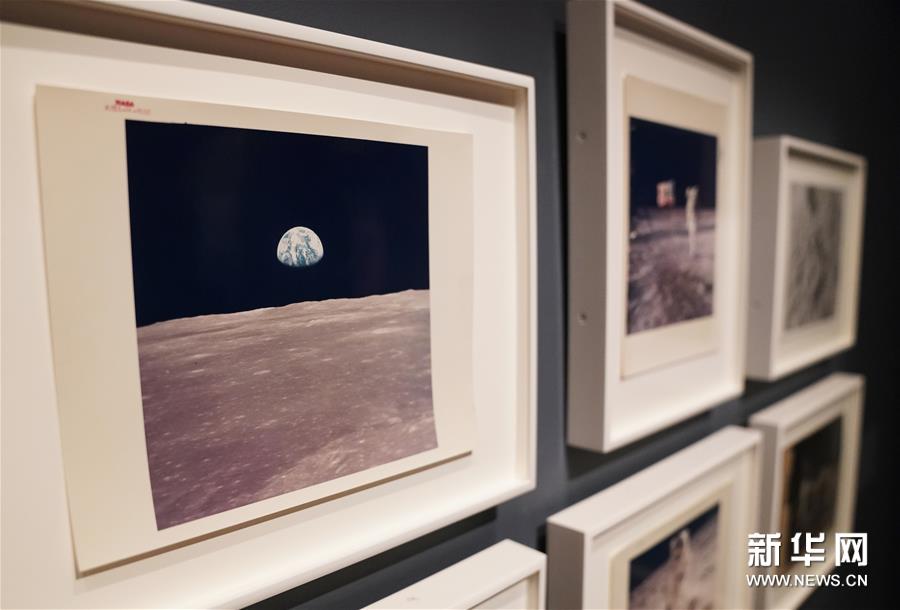 7月9日,在美国首都华盛顿,一幅从月球上拍摄的地球照片(左一)在“银色月光下:百年月球影像”媒体预展上展出。新华社记者 刘杰 摄