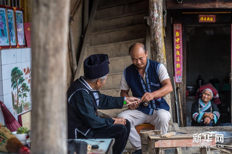 张荣华老人(左)在家中与孙子张国庆(中)一起制作水竹花伞(7月9日摄)。新华社记者江文耀摄