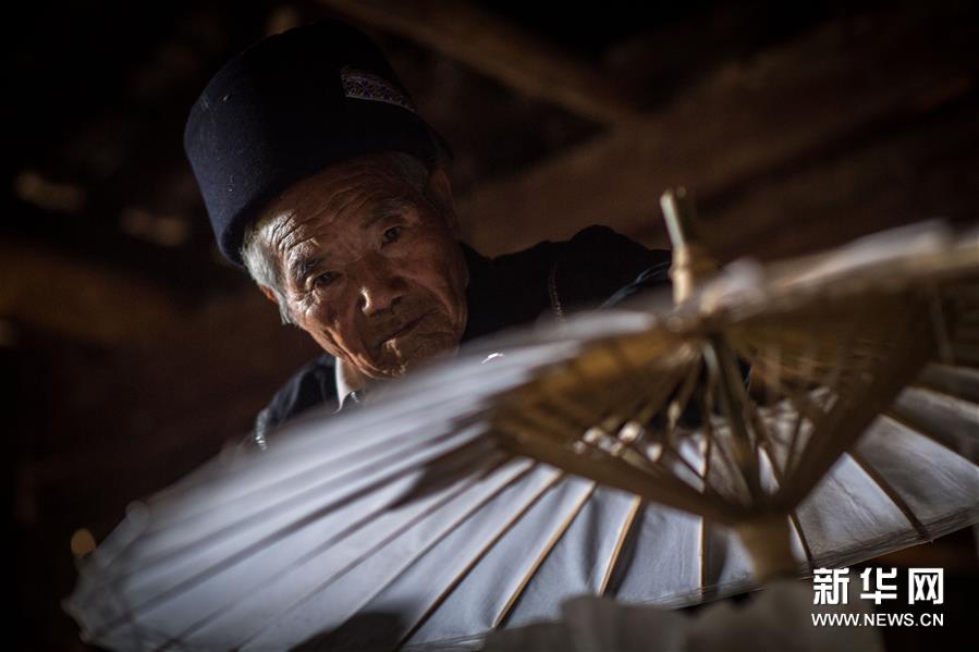 张荣华老人在家中查看裱糊完毕正在晾晒的水竹花伞(7月9日摄)。 新华社记者江文耀摄