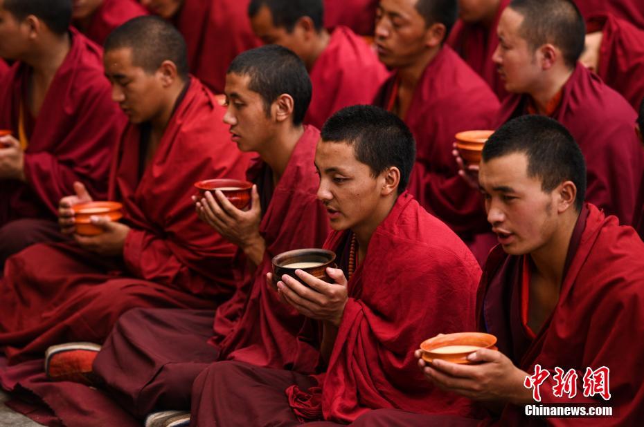 扎什伦布寺僧人在辩经前饮用斋茶。中新社记者 何蓬磊 摄