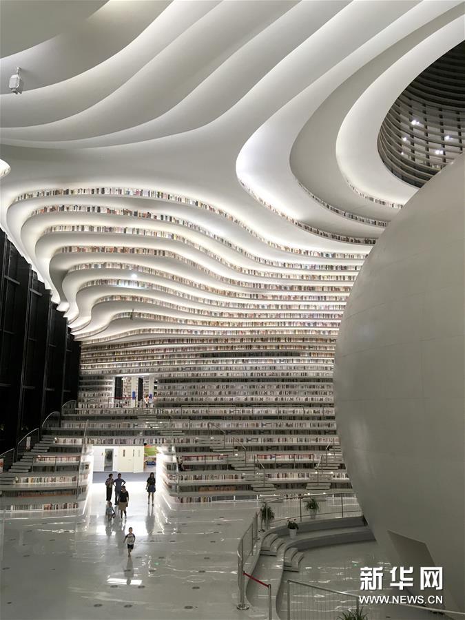 7月16日晚拍摄的天津滨海新区图书馆。 近日,为进一步丰富市民夜间文化生活,天津市滨海新区文化和旅游局推出公共文化服务的利民举措。从7月8日开始,天津滨海新区图书馆、滨海新区博物馆和滨海新区美术馆等文化场馆开展夜间延时服务,延时开放至22点至22点30分。 新华社记者岳月伟摄