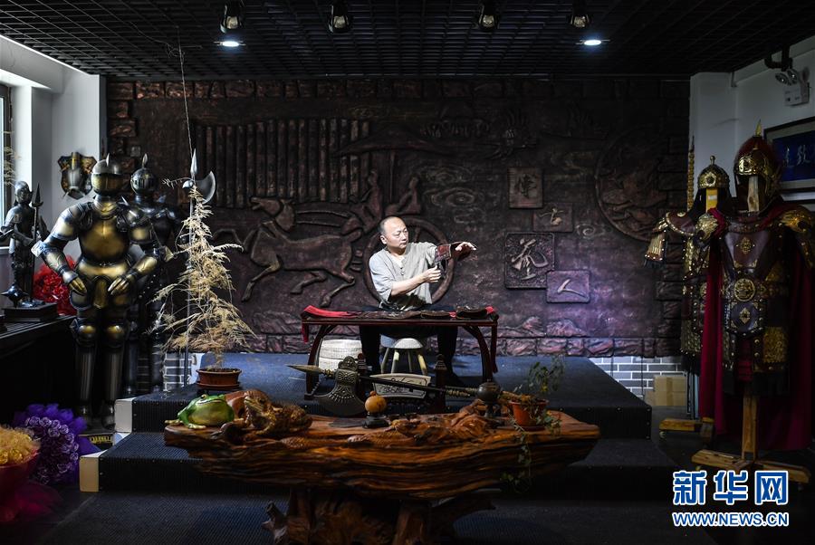 杨光权在试戴制作的铠甲护手配件(7月22日摄)。 今年50岁的杨光权,自幼跟随家中长辈学习打铁技艺,对手工制品充满兴趣。他年轻时干过铁匠,做过买卖。2013年,他萌发了制作金属工艺品的念头,便重新拾起打铁锤,用着老技艺,做起新产品。 走进杨光权位于长春市巴蜀映巷文化商业街区的工作室,栩栩如生的盔甲勇士、精致的金属摆件让人应接不暇。杨光权认为,若要生存,便必须谋求创新,这样才能既守匠心又保生计。“铁艺的苦是在设计、制作过程中,你看不见的地方。而展现给人们的作品,必须是更符合时代,老百姓更喜闻乐见的形式。” 经过多年经营,如今杨光权的金属工艺品已获得许多人的喜爱。效益越来越好的同时,他还发起了一个草根艺人的合作平台,吸纳了近百位手艺人,涵盖剪纸、刀画、木雕等70多个手工技艺门类,由平台负责为工艺品找市场,让手艺人能够更专心于创作。 “在当下这个时代,手艺人更需要顺应生活,在坚守中创新,这样才能推动传统文化活起来,让老技艺焕发新生机,真正传承下去。”杨光权说。 新华社记者许畅摄