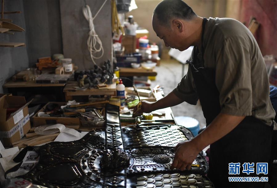杨光权在制作一具仿古铠甲(7月22日摄)。 今年50岁的杨光权,自幼跟随家中长辈学习打铁技艺,对手工制品充满兴趣。他年轻时干过铁匠,做过买卖。2013年,他萌发了制作金属工艺品的念头,便重新拾起打铁锤,用着老技艺,做起新产品。 走进杨光权位于长春市巴蜀映巷文化商业街区的工作室,栩栩如生的盔甲勇士、精致的金属摆件让人应接不暇。杨光权认为,若要生存,便必须谋求创新,这样才能既守匠心又保生计。“铁艺的苦是在设计、制作过程中,你看不见的地方。而展现给人们的作品,必须是更符合时代,老百姓更喜闻乐见的形式。” 经过多年经营,如今杨光权的金属工艺品已获得许多人的喜爱。效益越来越好的同时,他还发起了一个草根艺人的合作平台,吸纳了近百位手艺人,涵盖剪纸、刀画、木雕等70多个手工技艺门类,由平台负责为工艺品找市场,让手艺人能够更专心于创作。 “在当下这个时代,手艺人更需要顺应生活,在坚守中创新,这样才能推动传统文化活起来,让老技艺焕发新生机,真正传承下去。”杨光权说。 新华社记者许畅摄