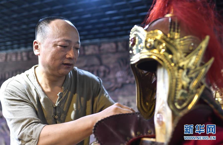 杨光权在组装一具仿古铠甲(7月22日摄)。 今年50岁的杨光权,自幼跟随家中长辈学习打铁技艺,对手工制品充满兴趣。他年轻时干过铁匠,做过买卖。2013年,他萌发了制作金属工艺品的念头,便重新拾起打铁锤,用着老技艺,做起新产品。 走进杨光权位于长春市巴蜀映巷文化商业街区的工作室,栩栩如生的盔甲勇士、精致的金属摆件让人应接不暇。杨光权认为,若要生存,便必须谋求创新,这样才能既守匠心又保生计。“铁艺的苦是在设计、制作过程中,你看不见的地方。而展现给人们的作品,必须是更符合时代,老百姓更喜闻乐见的形式。” 经过多年经营,如今杨光权的金属工艺品已获得许多人的喜爱。效益越来越好的同时,他还发起了一个草根艺人的合作平台,吸纳了近百位手艺人,涵盖剪纸、刀画、木雕等70多个手工技艺门类,由平台负责为工艺品找市场,让手艺人能够更专心于创作。 “在当下这个时代,手艺人更需要顺应生活,在坚守中创新,这样才能推动传统文化活起来,让老技艺焕发新生机,真正传承下去。”杨光权说。 新华社记者许畅摄