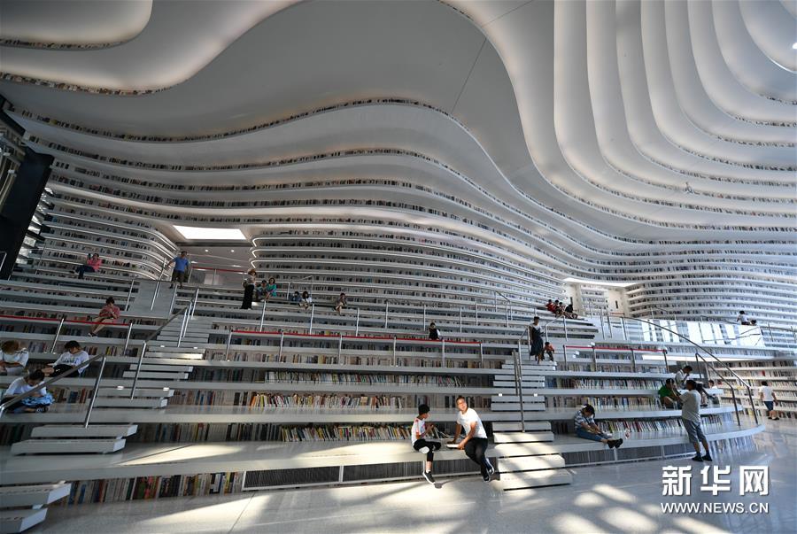 这是天津滨海新区图书馆一景(7月31日摄)。 进入暑期以来,天津滨海新区图书馆入馆人数持续上升,7月日均进馆人数超过7000人次,不少市民来此阅读学习,消暑度夏。滨海新区图书馆位于天津滨海文化中心,设计立意为“滨海之眼”和“书山有路勤为径”。2017年10月1日正式开馆,目前已经藏书100多万册。 新华社记者 黄臻 摄