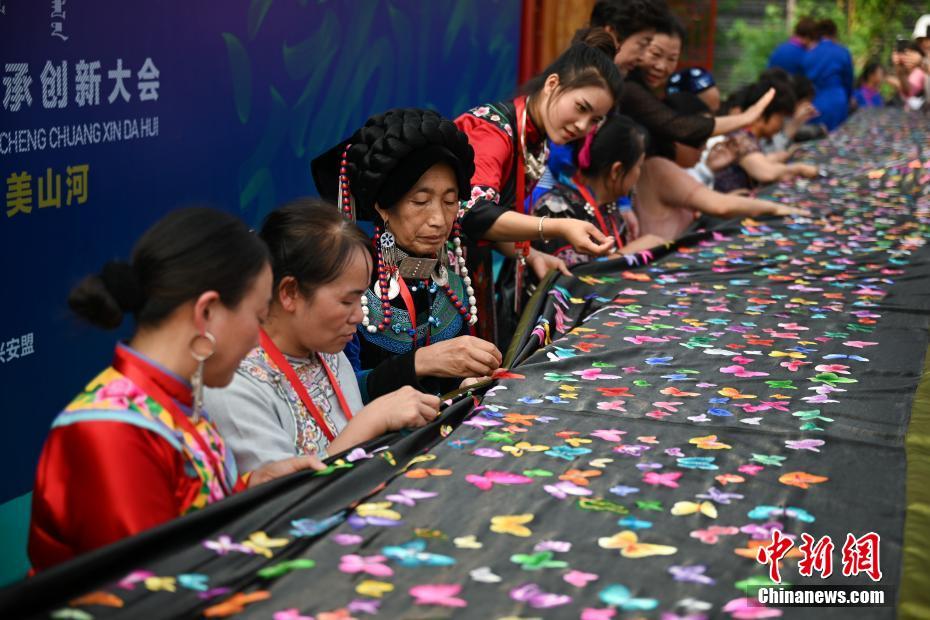 据悉,本次大会旨在通过展览、论坛、参观等活动,培育“蒙古族刺绣”品牌,推进中国手工刺绣技艺传承、设计生产、产业发展、市场营销,推动以科右中旗为中心的内蒙古东部地区逐步成为中国手工刺绣重要的培训生产基地。图为四川省级非遗北川羌绣传承人陈云珍(右)与蒙古族绣娘交流。