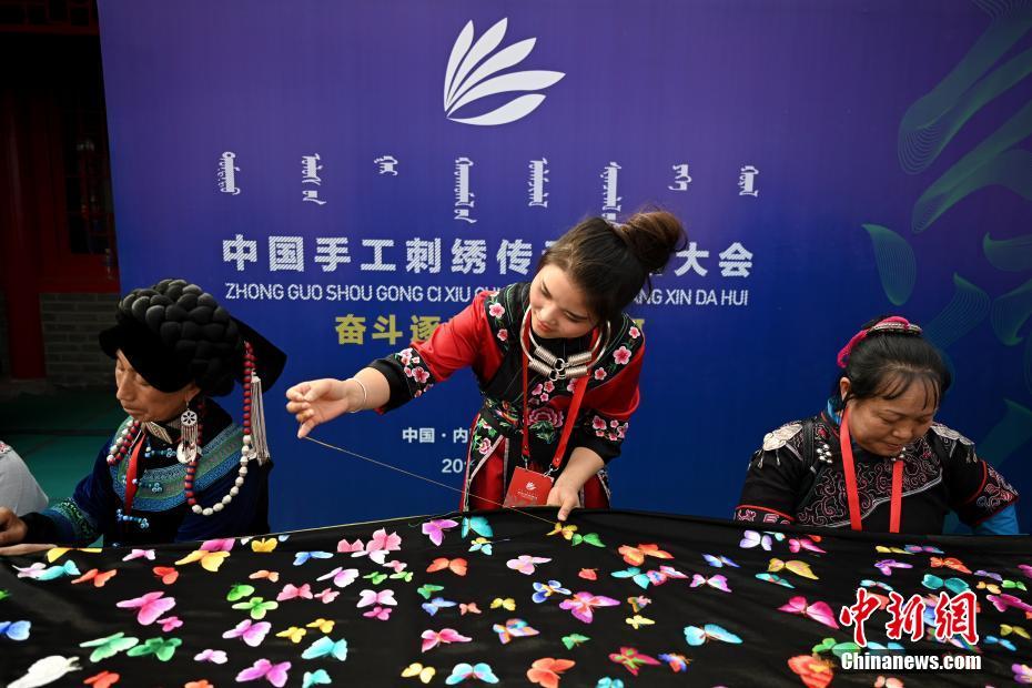 据悉,本次大会旨在通过展览、论坛、参观等活动,培育“蒙古族刺绣”品牌,推进中国手工刺绣技艺传承、设计生产、产业发展、市场营销,推动以科右中旗为中心的内蒙古东部地区逐步成为中国手工刺绣重要的培训生产基地。图为四川省级非遗北川羌绣传承人陈云珍(右)与蒙古族绣娘交流。