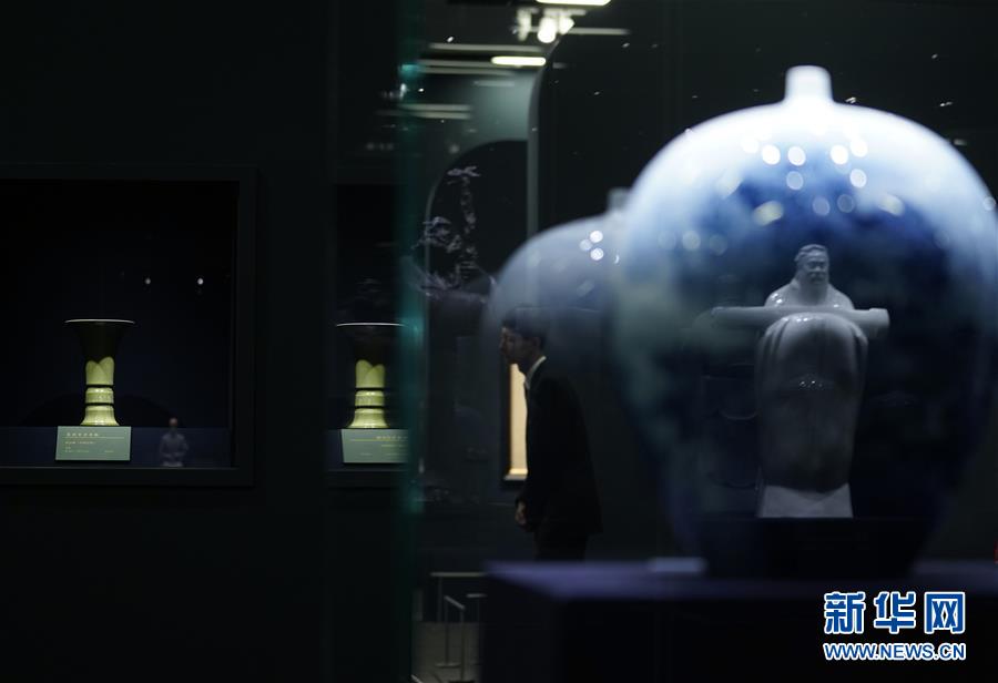 这是展出的何志隆作品《柴烧青瓷花觚》(左一)(8月20日摄)。新华社记者 金良快 摄