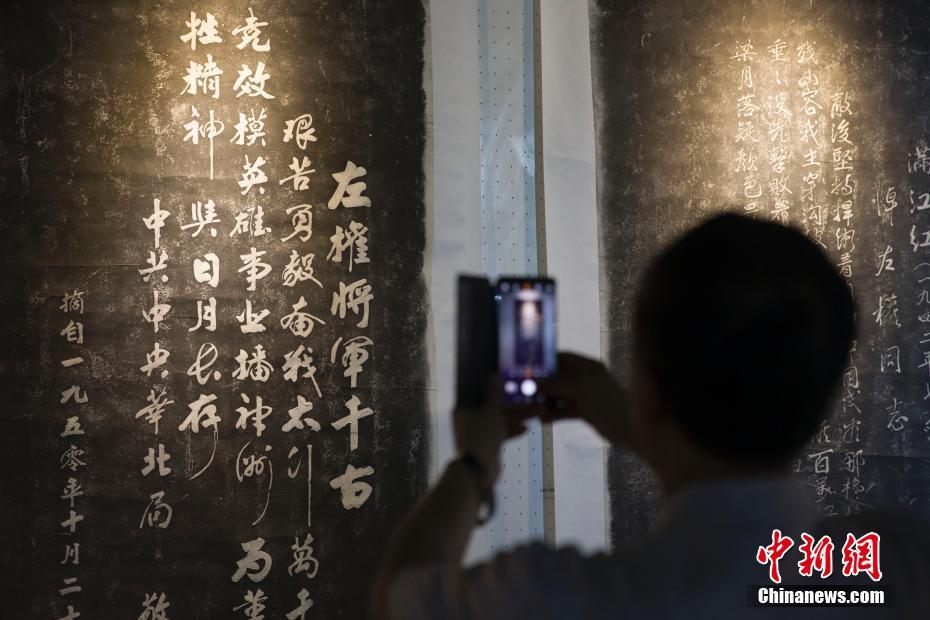 9月3日,山西省太原市,参观者正在拍摄展品。当日,《太行英烈碑拓片展》在山西大学展出,此次共展出140余幅抗战英烈碑刻拓片,这些碑刻散落在太行山各地,参观者可通过拓片重温“碑文上的抗战”。中新社记者 张云 摄