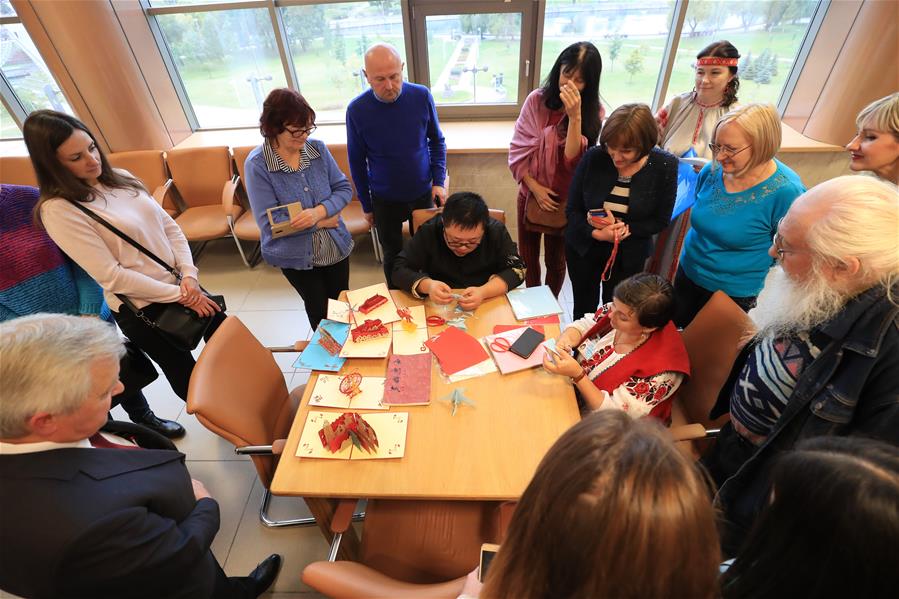 9月25日,在白俄罗斯首都明斯克,艺人向观众展示中国剪纸艺术。 中白民间艺术精品展25日在白俄罗斯国家图书馆开幕。