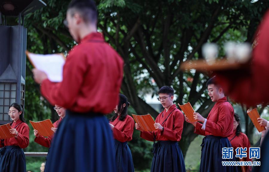 10月7日,在德阳市钟鼓楼广场,德阳市第五中学的学生们诵读《百孝经》,弘扬中国传统孝文化和礼仪。 当日,四川省“我们的节日·重阳”示范活动在德阳启幕,诗朗诵、太极拳表演、插茱萸、登山等特色活动,吸引了众多市民参与。 新华社记者 江宏景摄