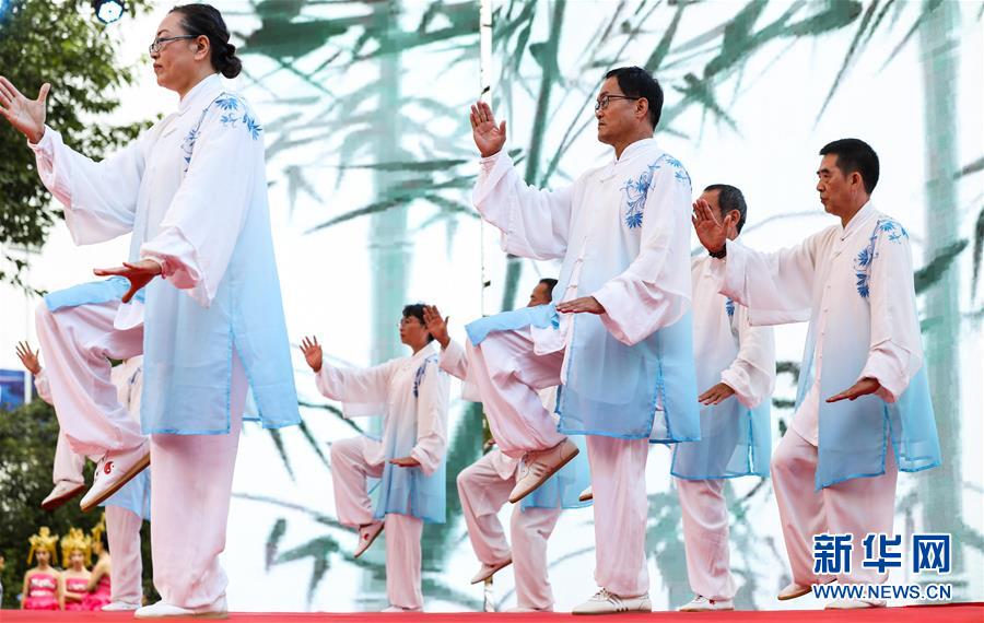 10月7日,在德阳市钟鼓楼广场,德阳市老年协会的老人们进行太极拳表演。 当日,四川省“我们的节日·重阳”示范活动在德阳启幕,诗朗诵、太极拳表演、插茱萸、登山等特色活动,吸引了众多市民参与。 新华社记者 江宏景摄