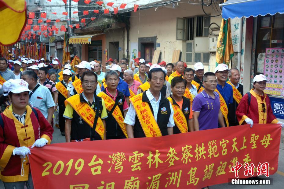 10月10日,20多家台湾妈祖宫庙的800余名妈祖信众来到福建省漳州市的上街天后宫谒祖进香。图为台湾信众在上街天后宫旁主要街道绕巡,热闹非凡。中新社记者 龚雯 摄