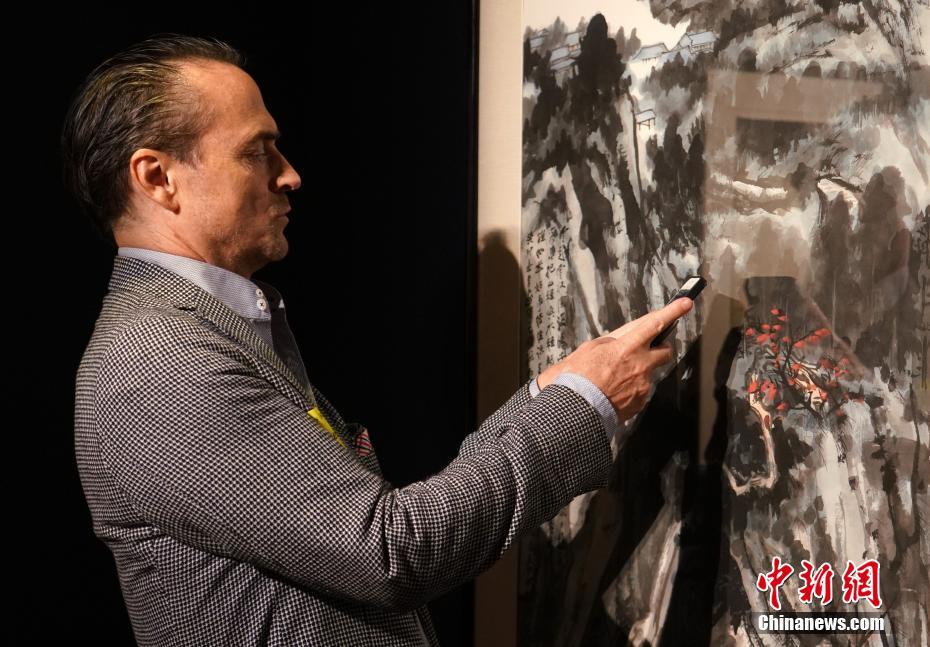 为纪念张大千诞辰120周年,香港苏富比主办、台北羲之堂协办的“无象之象——张大千精品展”将于10月12日至11月9日在香港举行。展览汇集张大千不同时期、不同风格的代表作近60幅,参展作品由画家家属、香港和海外收藏家提供,部分作品首次向公众展示。图为观众用手机拍摄画作局部。中新社记者 张炜 摄