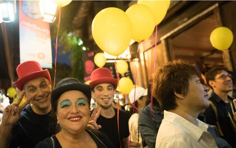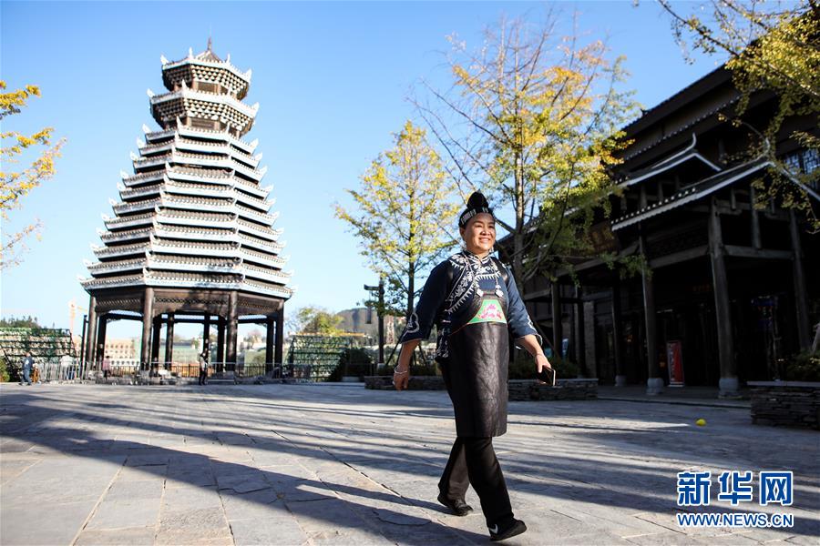 10月29日,杨芳从丹寨万达小镇内的鼓楼前经过。