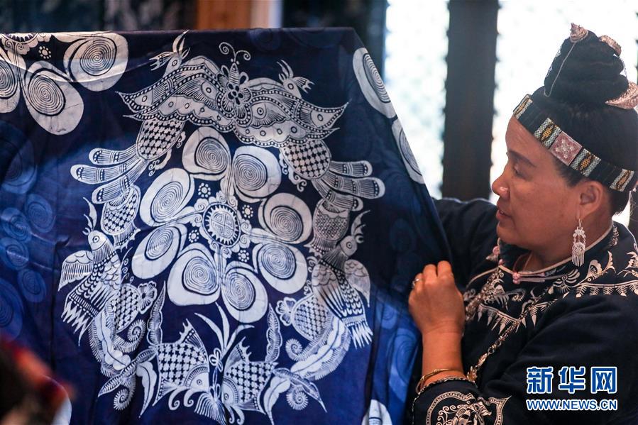 10月29日,杨芳在位于丹寨万达小镇内的工作室内查看用蜡染工艺制成的真丝披肩。新华社记者 欧东衢 摄