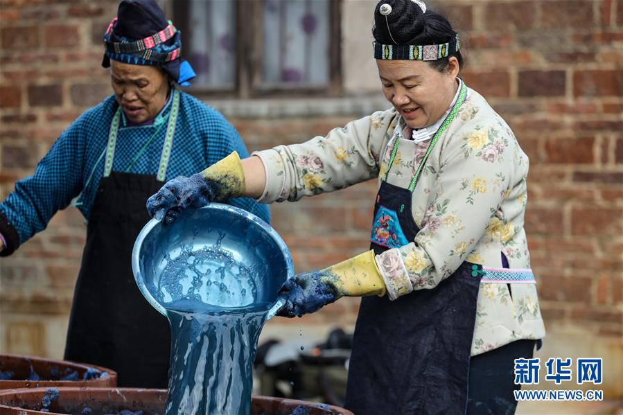 10月28日,杨芳(右)在家中制作靛蓝染料。新华社记者 欧东衢 摄