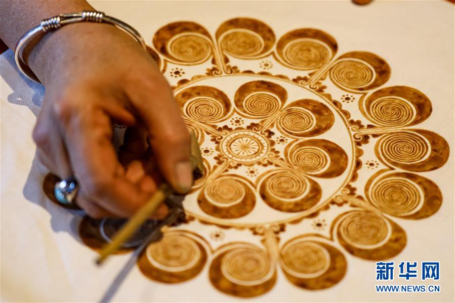 10月29日,杨芳在位于丹寨万达小镇内的工作室内绘制蜡染图案。新华社记者 欧东衢 摄