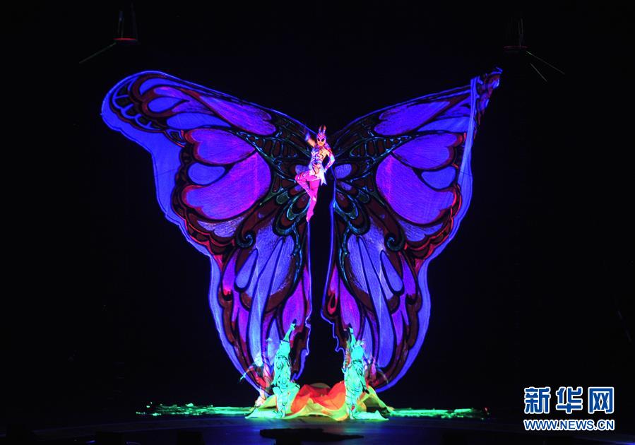 11月3日,来自俄罗斯的演员在表演《“蝴蝶”——夜光空中飞人》。 当日,第十七届中国吴桥国际杂技艺术节沧州会场世界杂技精品惠民展演在河北省沧州市体育馆举行。中国吴桥国际杂技艺术节创办于1987年,每两年举办一届,是我国杂技艺术领域举办历史最长、规模最大、影响最广的国家级艺术赛事和文化节庆活动。 新华社记者 牟宇 摄