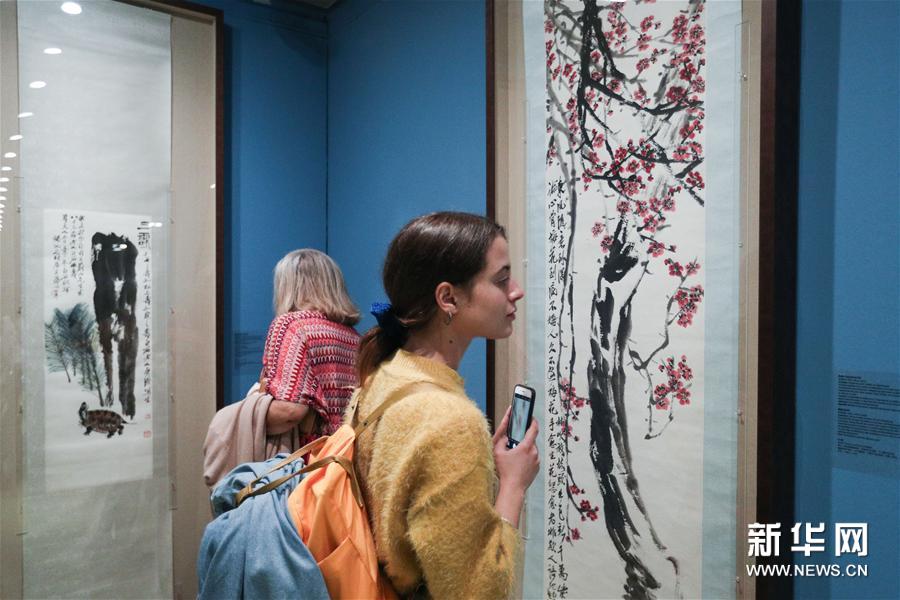 11月12日,观众在希腊雅典塞奥哈拉基斯艺术基金会美术馆观看齐白石艺术展。