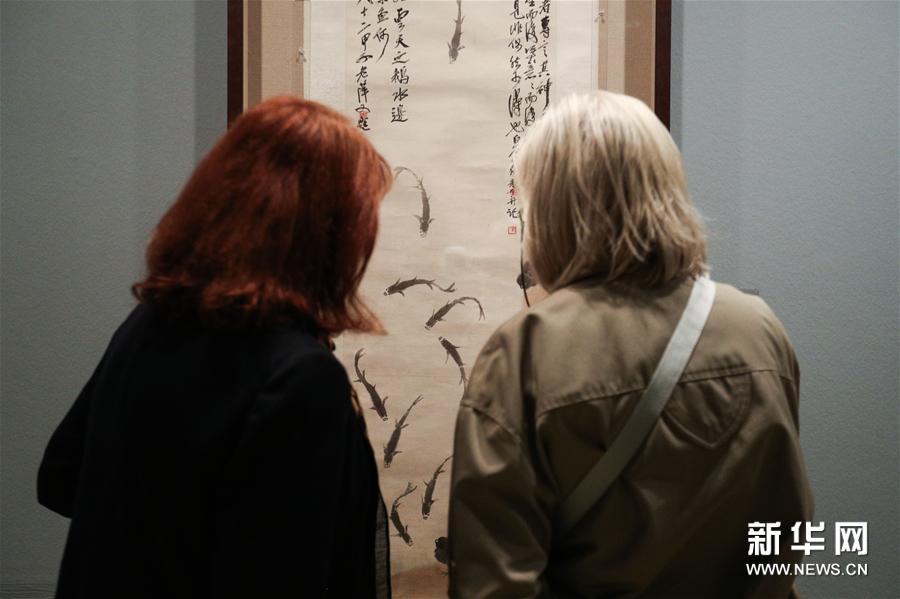 11月12日,观众在希腊雅典塞奥哈拉基斯艺术基金会美术馆观看齐白石艺术展。