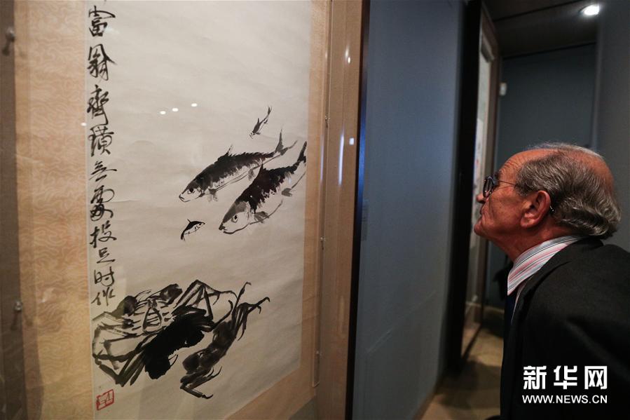 11月12日,观众在希腊雅典塞奥哈拉基斯艺术基金会美术馆观看齐白石艺术展。