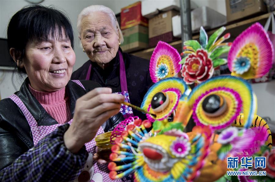 12月4日,李金贤(左)与婆婆在为花馍上彩。85岁的婆婆党福宁是当地出了名的花馍“巧手”。 新华社记者陶明摄