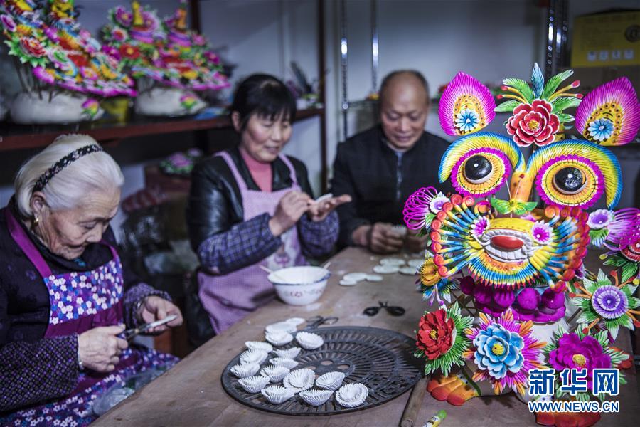 12月4日,李金贤(中)与婆婆、丈夫在家中制作花馍。 新华社记者陶明摄
