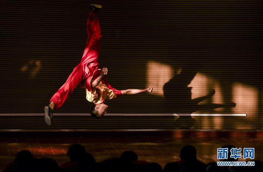 12月5日,在乌鲁木齐市第三十中学礼堂,乌鲁木齐市天山区业余体校武术表演队队员展示武术。 当日下午,“中华优秀传统文化进校园”活动在乌鲁木齐市第三十中学举办。乌鲁木齐市天山区“红色文艺轻骑兵”等表演者为师生带来传统文化节目表演。 新华社记者 王菲 摄