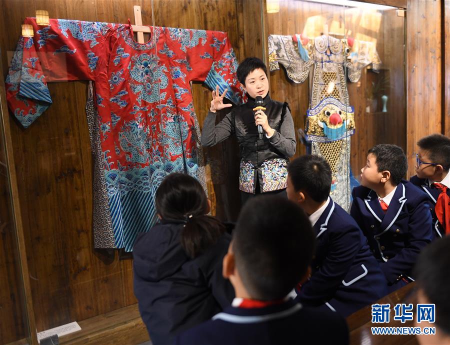 12月11日,杨崑(上)在“小河驿国际昆曲会客厅”为前来研学的小学生介绍昆曲戏服。 在京杭大运河最南端、杭州市拱墅区一条传统的江南小巷里,有一个“昆曲会客厅”,时常传出曼妙的昆曲声腔。会客厅的“主人”是浙江昆剧团演员杨崑。为向公众普及昆曲的基本知识、为昆曲爱好者和专家搭建交流平台,杨崑在传统文化街区小河直街开设了“小河驿国际昆曲会客厅”,受到了市民和游客的欢迎。“我是一名昆曲演员,也是一个传播者,希望更多人来了解昆曲。”杨崑说。 新华社记者翁忻旸摄