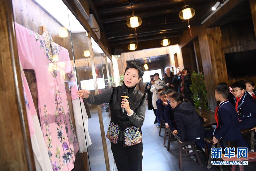 12月11日,杨崑(左一)在“小河驿国际昆曲会客厅”为前来研学的小学生介绍昆曲戏服。 在京杭大运河最南端、杭州市拱墅区一条传统的江南小巷里,有一个“昆曲会客厅”,时常传出曼妙的昆曲声腔。会客厅的“主人”是浙江昆剧团演员杨崑。为向公众普及昆曲的基本知识、为昆曲爱好者和专家搭建交流平台,杨崑在传统文化街区小河直街开设了“小河驿国际昆曲会客厅”,受到了市民和游客的欢迎。“我是一名昆曲演员,也是一个传播者,希望更多人来了解昆曲。”杨崑说。 新华社记者翁忻旸摄
