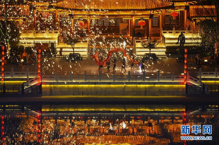 12月31日晚,民间艺人在山东台儿庄古城景区表演“火龙钢花”。 新华社记者 范长国 摄