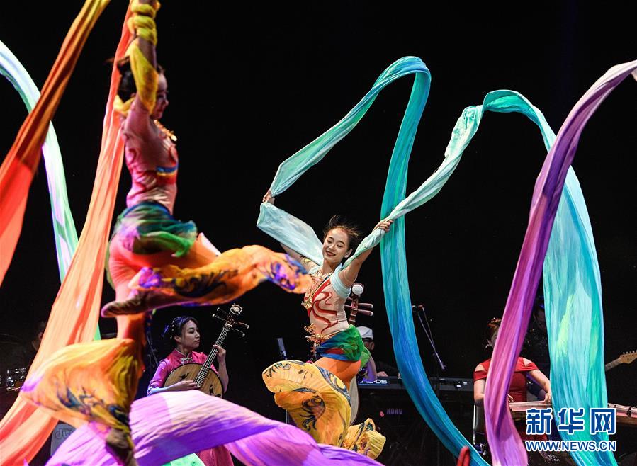 1月10日,在智利比尼亚德尔马,中国深圳艺术团演员在“欢乐春节”庆典晚会上表演乐舞《敦煌新语》。 第十届“欢乐春节”庆典晚会10日在智利海滨城市比尼亚德尔马的贝尔加拉椭圆形剧场举行。中国深圳艺术团为上万名观众带来一台“梅兰竹菊”新民乐跨界音乐舞蹈晚会。 新华社发(豪尔赫·比列加斯摄)