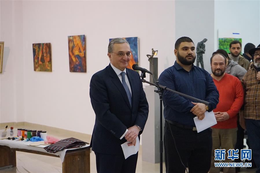 2月19日,在亚美尼亚首都埃里温,亚美尼亚外长姆纳察卡尼扬出席画家现场作画活动。 当日,来自亚美尼亚美术家协会、美术学院等艺术团体的6名画家在首都埃里温联袂现场作画,为中国人民抗击新冠肺炎疫情加油。 新华社发(中国驻亚美尼亚大使馆供图)