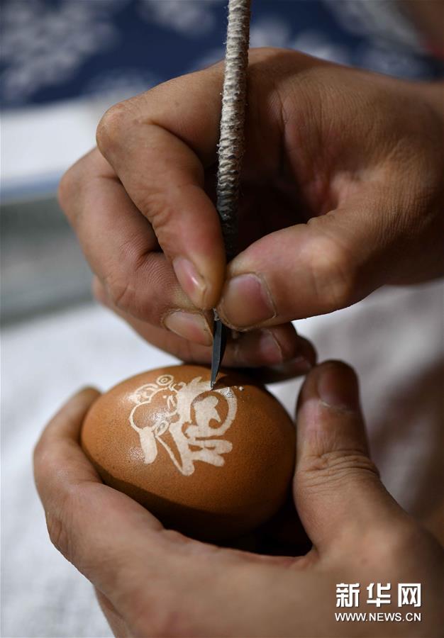 4月17日,在石家庄市桥西区非遗传承基地,民间艺人张晓贺在进行蛋雕创作。新华社发(陈其保 摄)