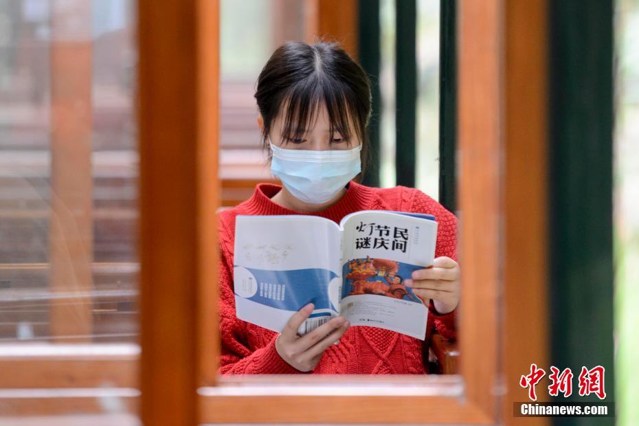 4月23日,正值世界读书日,湖南汝城九龙江国家森林公园的小火车内摆放了众多图书,吸引了市民纷纷乘车阅读。图为市民在火车内阅读。 杨华峰 摄