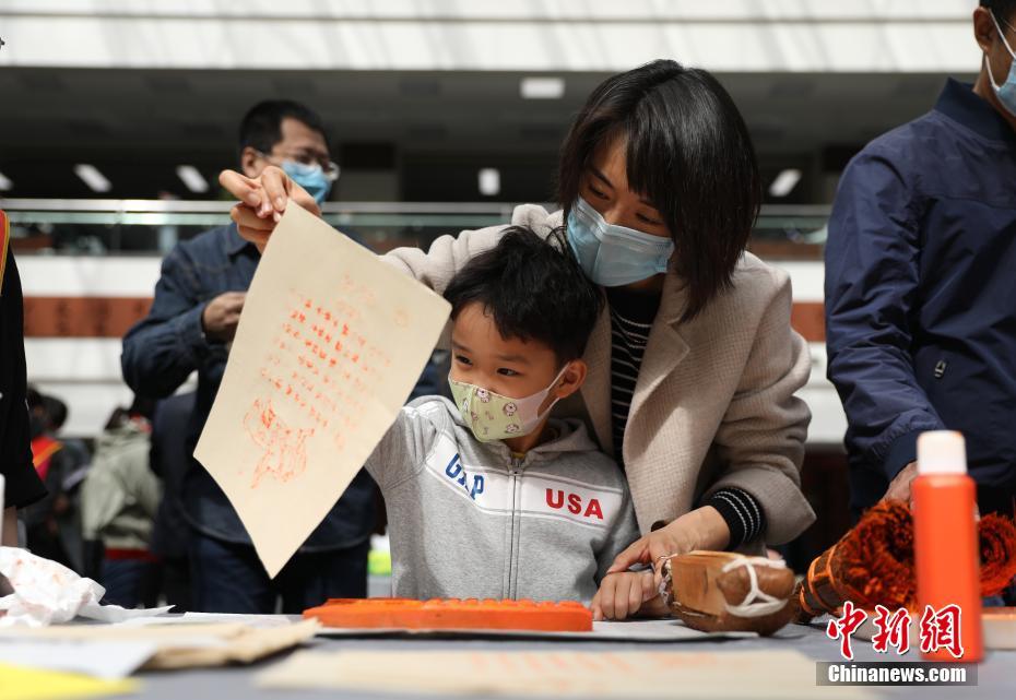 4月23日,一位母亲带着孩子体验雕版印刷。当天,“4·23世界读书日”系列活动在银川的宁夏图书馆启动,线装书装帧、雕版印刷、活字印刷等古籍传承互动体验吸引众多市民参加。中新社记者 杨迪 摄