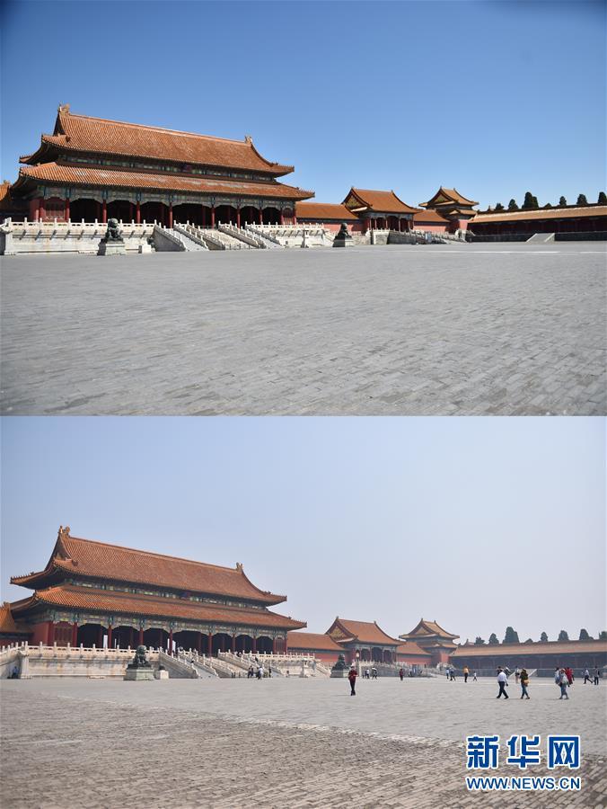 拼版照片:上图为4月2日拍摄的暂停对外开放的故宫博物院;下图为5月1日拍摄的恢复开放的故宫博物院。 5月1日起,北京地区博物馆陆续恢复开放。 新华社发(陈钟昊摄)
