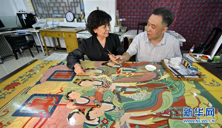 5月4日,屏风设计人、国家级非物质文化遗产“金漆镶嵌髹饰技艺”代表性传承人柏群(右)和领衔主创的工艺美术大师胡昕进行屏风画面的最后检视。 新华社记者 李欣 摄