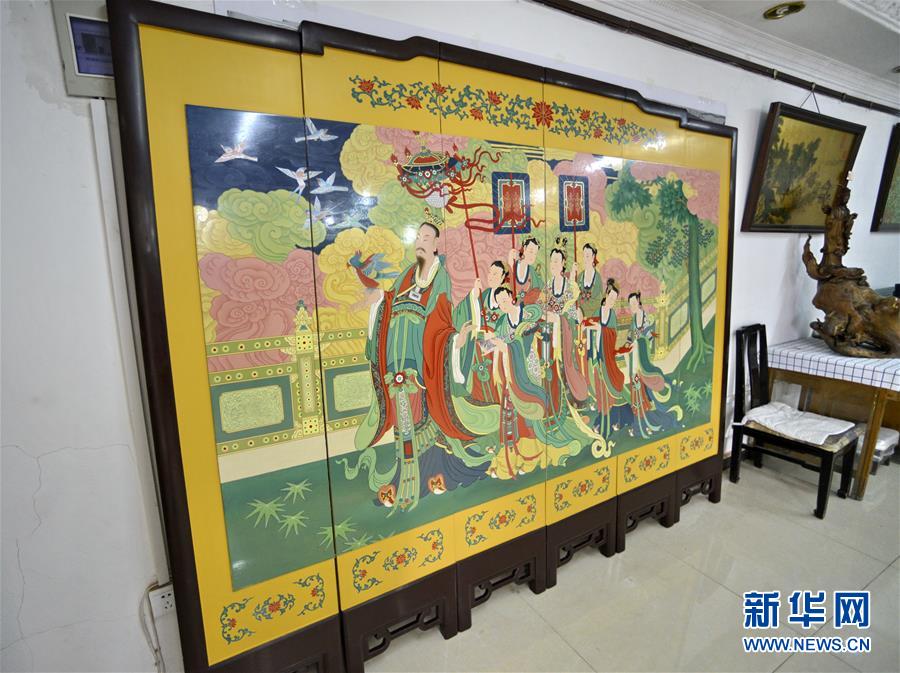5月4日拍摄的采用金漆镶嵌彩绘工艺绘制完成的承恩寺壁画屏风《帝后放飞图》。 新华社记者 李欣 摄