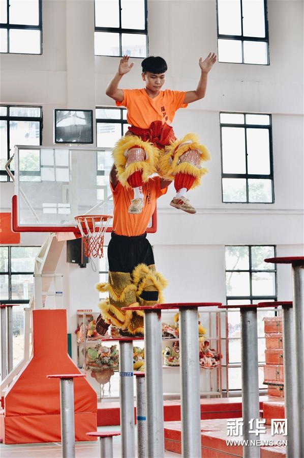 在广西藤县中等专业学校,邱海威(上)和黄庆良在进行舞狮训练(6月10日摄)。新华社记者 崔博文 摄