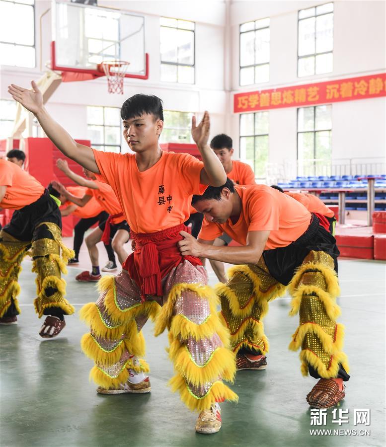在广西藤县中等专业学校,邱海威(前)和黄庆良在进行舞狮训练(6月10日摄)。新华社记者 曹祎铭 摄