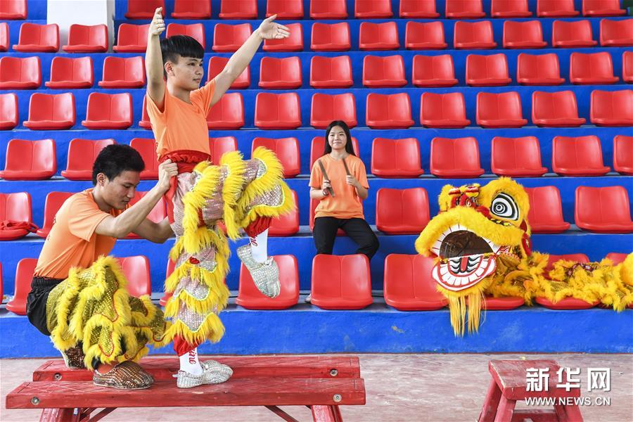在广西藤县中等专业学校,邱海威(中)、黄庆良(左)和覃金敏进行舞狮训练(6月10日摄)。新华社记者 曹祎铭 摄
