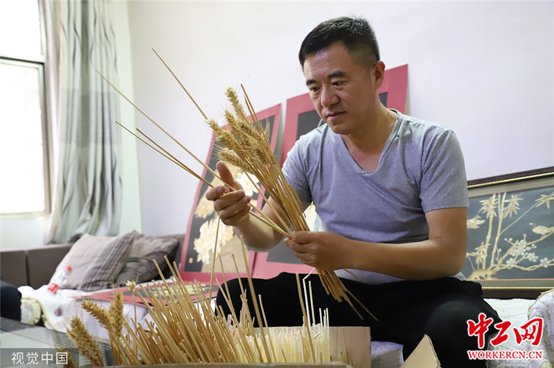 2020年6月15日,河南省商丘市民权县绿洲街道民间手工艺师张蕾在认真挑选麦秸秆。(马玉/视觉中国)