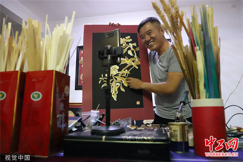 2020年6月15日,河南省商丘市民权县绿洲街道民间手工艺师张蕾在通过网络直播推介自己创作的麦秆画。(马玉/视觉中国)
