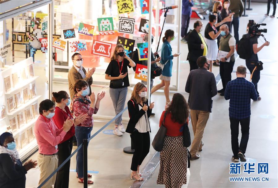 7月1日,法国巴黎蓬皮杜艺术中心的工作人员鼓掌欢迎参观者。 因新冠疫情关闭的法国巴黎蓬皮杜艺术中心于7月1日重新开门迎客。目前,中心只开放6层的临时展区和4、5层的现代艺术常设展区。参观者需提前网上预约参观时段,11岁以上参观者须佩戴口罩,参观过程中保持安全距离。 新华社记者 高静 摄