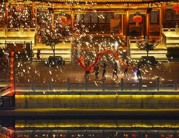 12月31日晚,山东省枣庄市台儿庄古城推出“火龙钢花”“威风锣鼓”“渔灯舞”等民俗表演迎接新年的到来。