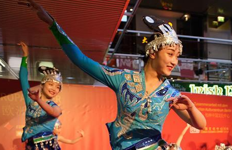 1月10日,在德国柏林“欧洲中心”大厦内,中国贵州省歌舞剧院艺术团的演员们为观众献上演出。