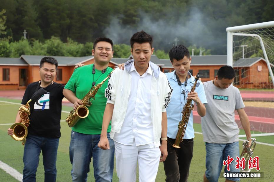 9月18日,盲人乐团成员互相搀扶走向演出现场。当日,在贵州省惠水县的贵州盛华职业学院内,由12名视障或者盲人学生组成的贵州省首支盲人乐团排练,队员中年纪最小的14岁,年纪最大的35岁,他们虽然眼前黑暗,但勇于用音乐寻找光明。中新社记者 瞿宏伦 摄